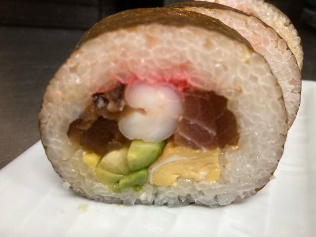 中身は漬けマグロ、玉子焼き、海老、かんぴょう、椎茸、アボカド、胡瓜、たくあん、桜でんぶ。と、盛りだくさん‼️